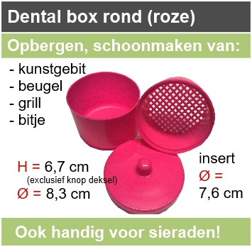 Solide kunststof bakje met deksel en insert. Voor het schoonmaken, veilig opbergen, bewaren, transporteren van o.a. een gebitsprothese, (partieel) kunstgebit, beugel, grill, (sport)bitje, apneu/snurk-bitje, sieraden...