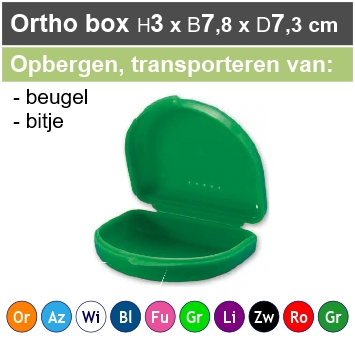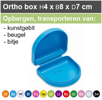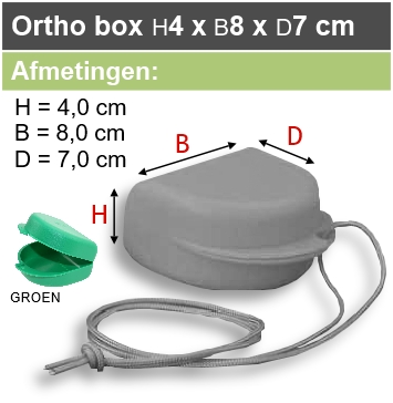 Solide kunststof bakje met ventilatie gaatjes, opent zoals een schelp. Voor het veilig opbergen, bewaren, transporteren van o.a. een kunstgebit, beugel, brace, (sport)bitje. Wordt geleverd inclusief een koortje (touwtje).